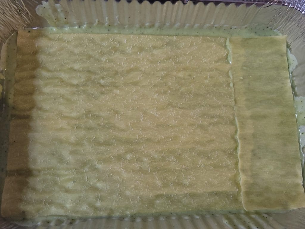 • Spread the béchamel with pesto at the base of the baking dish to start with the first layer of lasagna, insert the first sheet