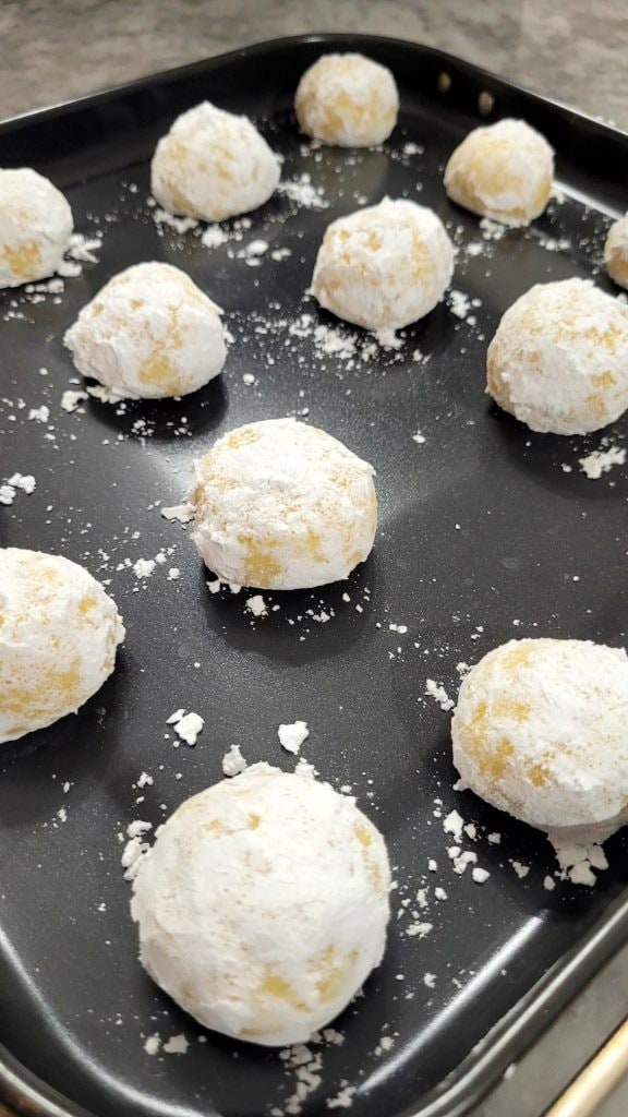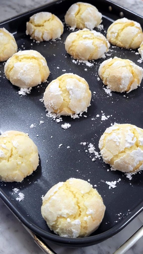 Preparing the lemon cookies is really simple, no molds or other utensils are needed: just a bowl and a hand whisk. You form balls with your hands, roll them first in granulated sugar, then in powdered sugar, and transfer them to a baking sheet or the air fryer’s grill.