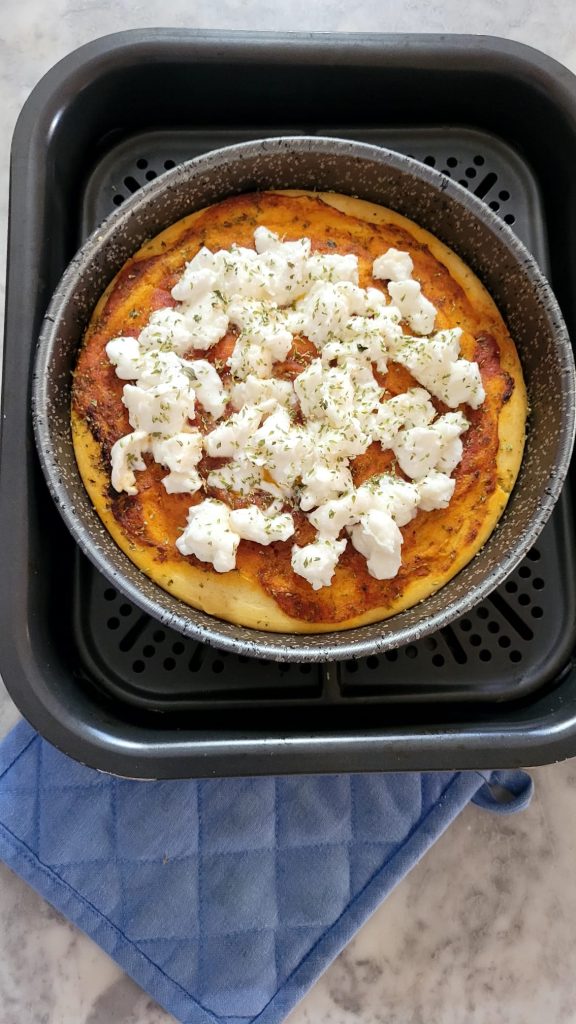If you have an air fryer with only one resistance, start cooking the pizza without toppings, when it begins to firm up, add the tomato sauce and then the mozzarella. If the base is not well cooked, turn it over using a plate, put it back in the pan, continue until the surface is golden, add the sauce, continue cooking, and finally melt the mozzarella.