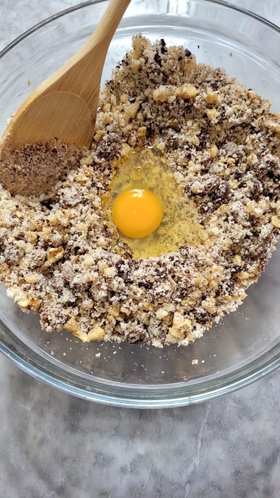 • While melting the butter in a small pot and rehydrating the raisins in a cup with lukewarm water, coarsely chop the dark chocolate and the walnuts with a knife, so you have them ready when you need to add them to the mixture.