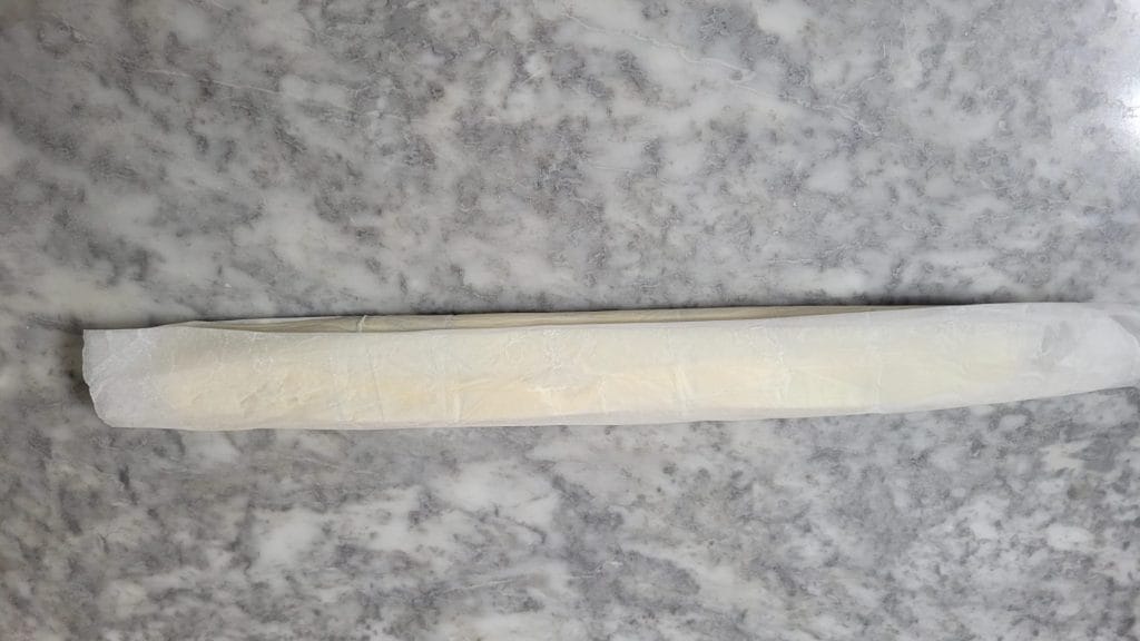 Roll the pastry from the long side, helping yourself with the parchment paper, and while rolling, gently squeeze