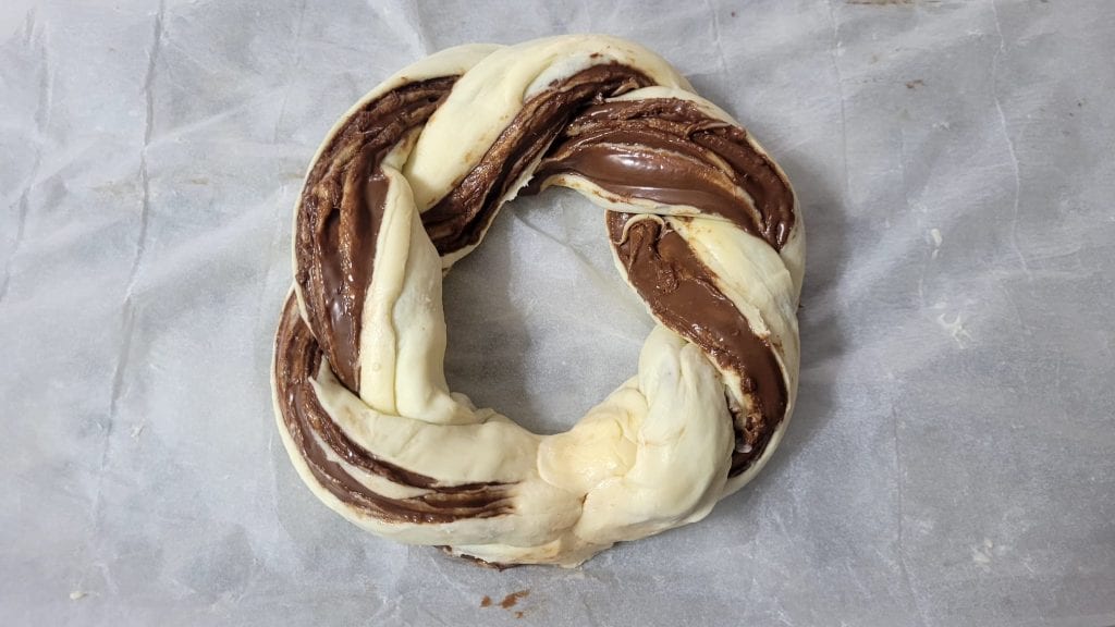 As I mentioned, to prepare the Nutella Puff Pastry Crown, you need very few minutes and even fewer ingredients: a rectangular puff pastry roll and Nutella. Just spread the cream on the pastry, roll it up, cut it in half, and braid it, but you will see this better in the steps section.
