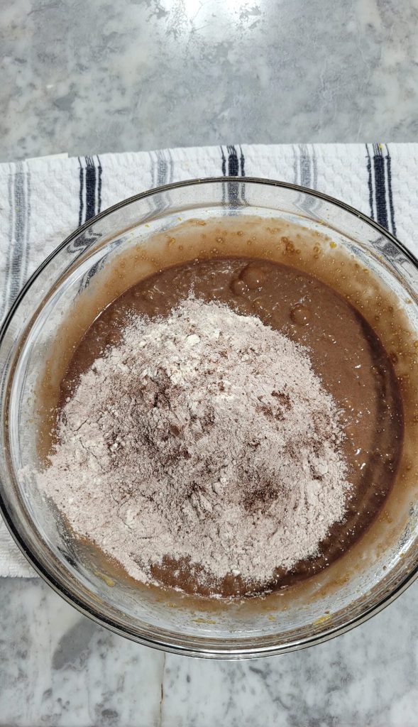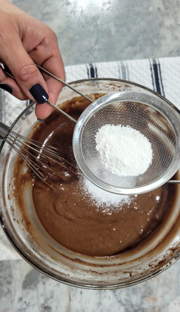 • Now incorporate the sifted flour and cocoa. Always use the whisk, mixing until you get a smooth batter