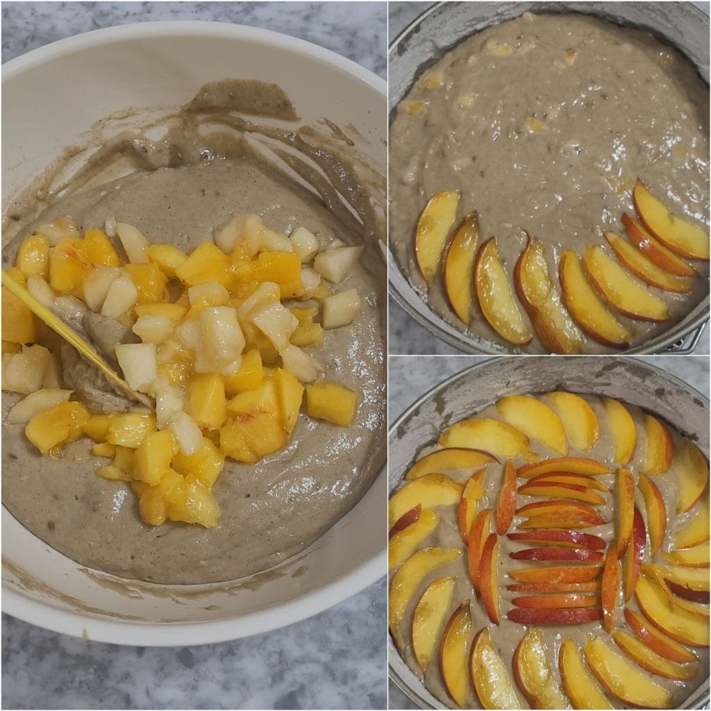 • Add the diced peaches to the batter and use a spatula to mix and incorporate them well. Now pour the batter into a greased and floured pan. Level the surface and arrange the peach slices in a radial pattern; you can of course decorate it as you prefer, but make sure not to submerge them completely in the batter, as they will sink during baking.