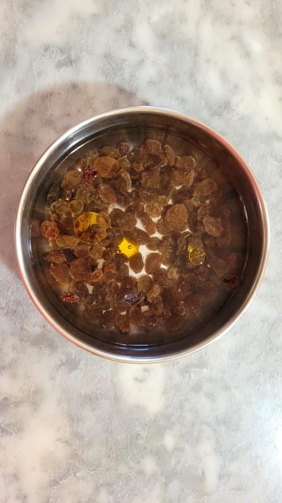 • Rehydrate the raisins in a bowl with warm water and a few drops of orange blossom water for 10 minutes.