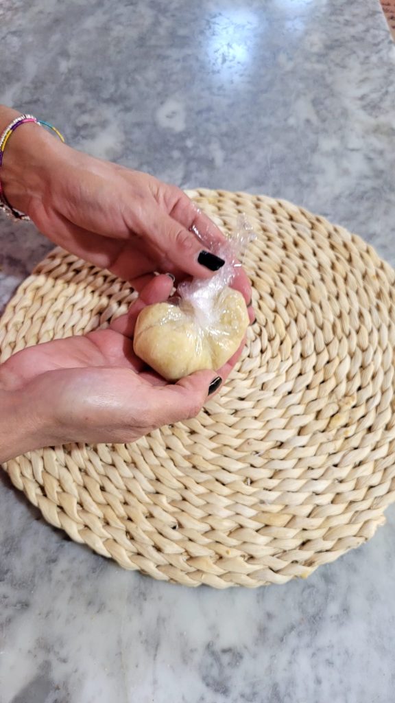 • After resting in the fridge, take the dough and roll it out between two floured parchment paper sheets.