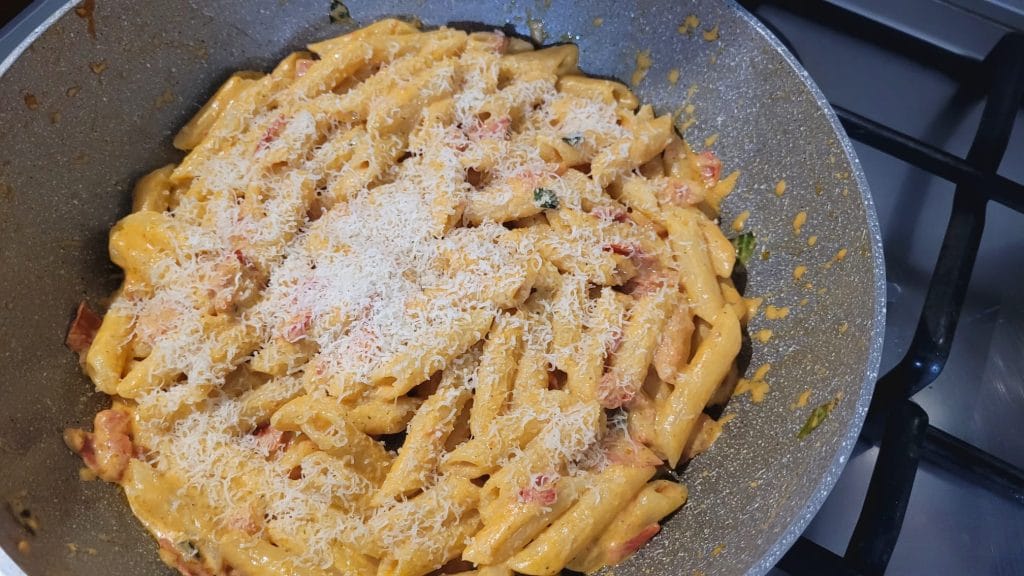 Sprinkle with grated Grana Padano or Parmesan, mix and serve with some fresh basil leaves