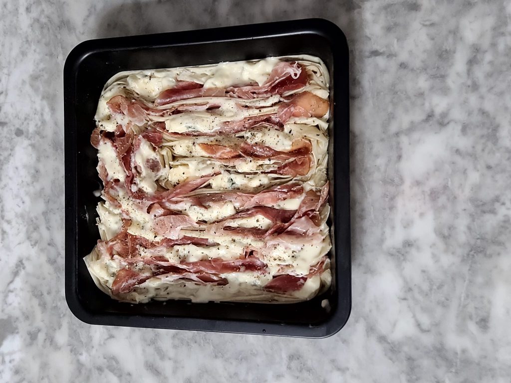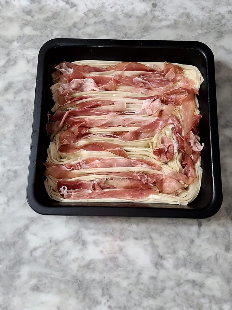 • Fill the gaps in the phyllo with speck slices