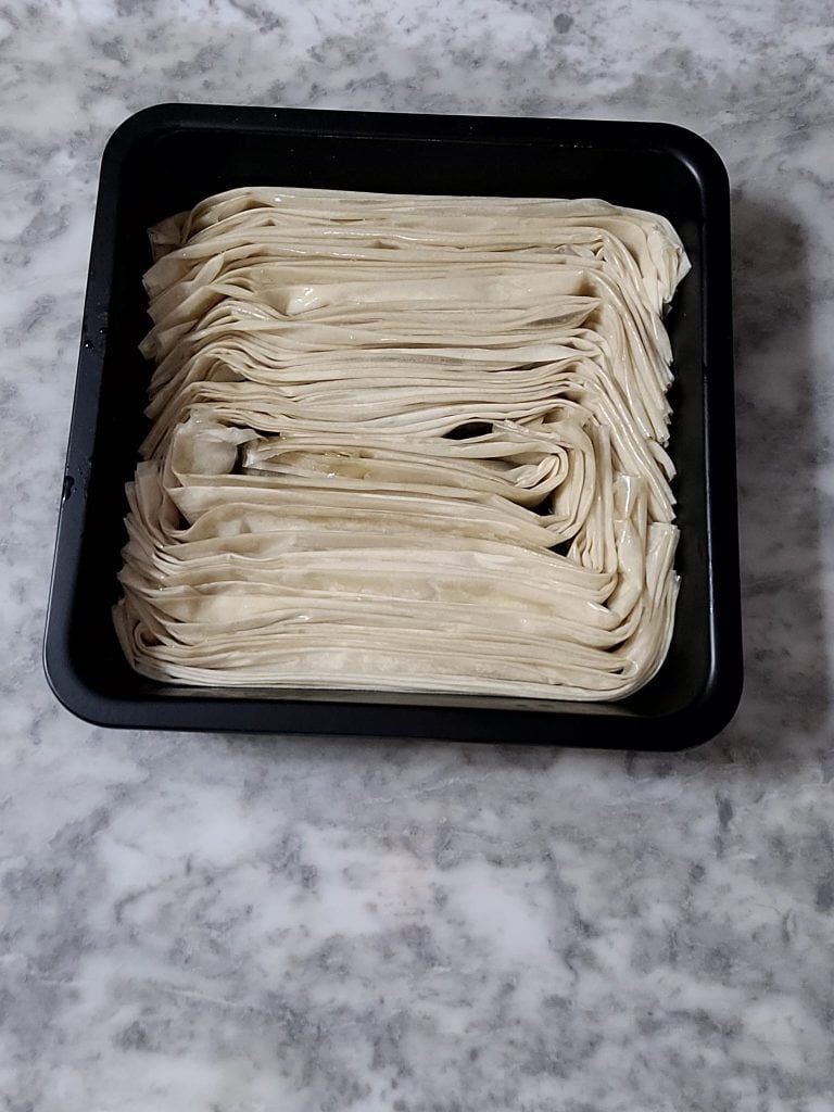 • Do this with all the sheets and, as you prepare them, insert them into the tray. I used a square tray; ideally, a rectangular tray would be better