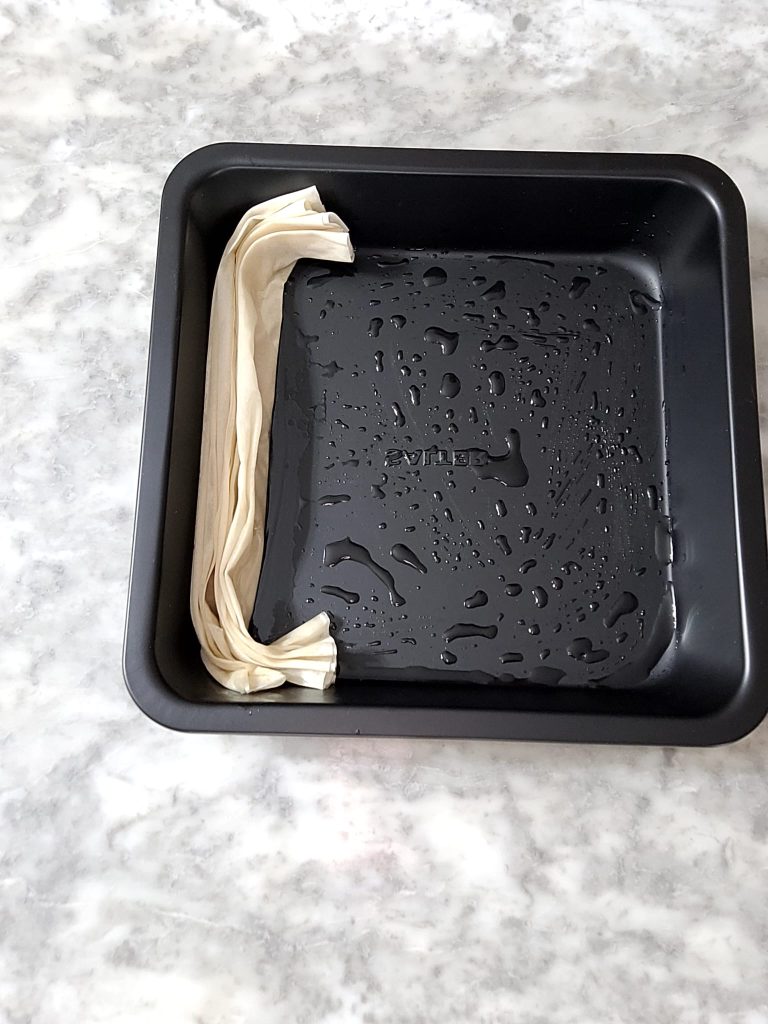 • Grease the baking tray you will use for cooking the phyllo dough accordion with some extra virgin olive oil