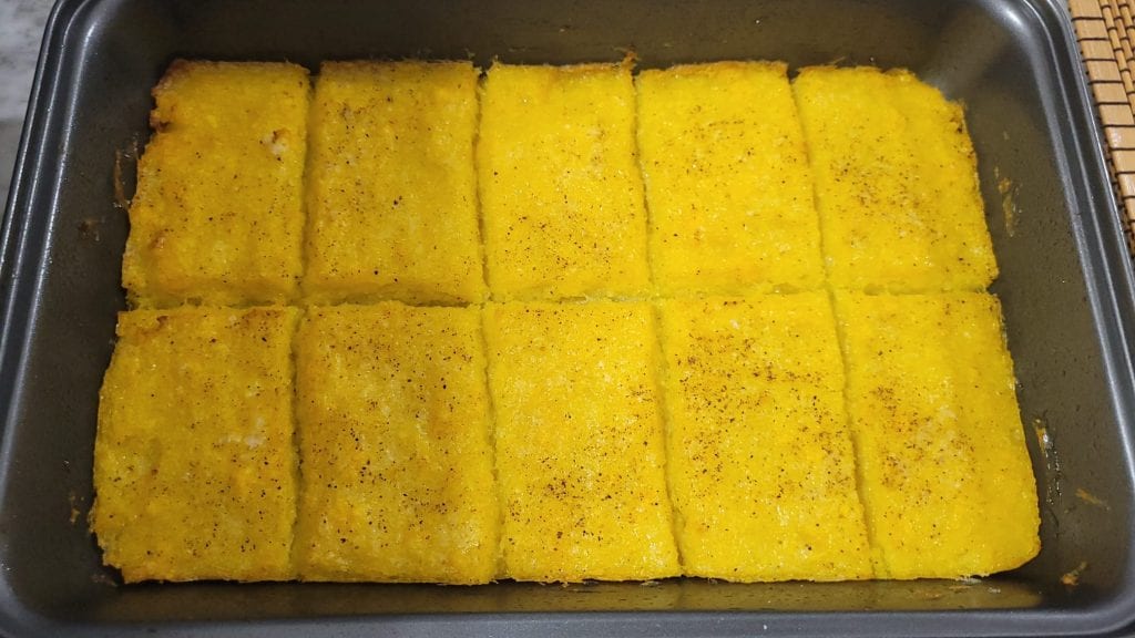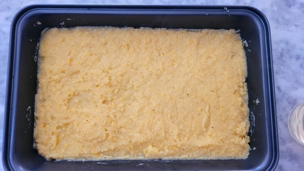 Pour the hot polenta into a rectangular tray, previously oiled. Let it cool for 10/15 minutes
