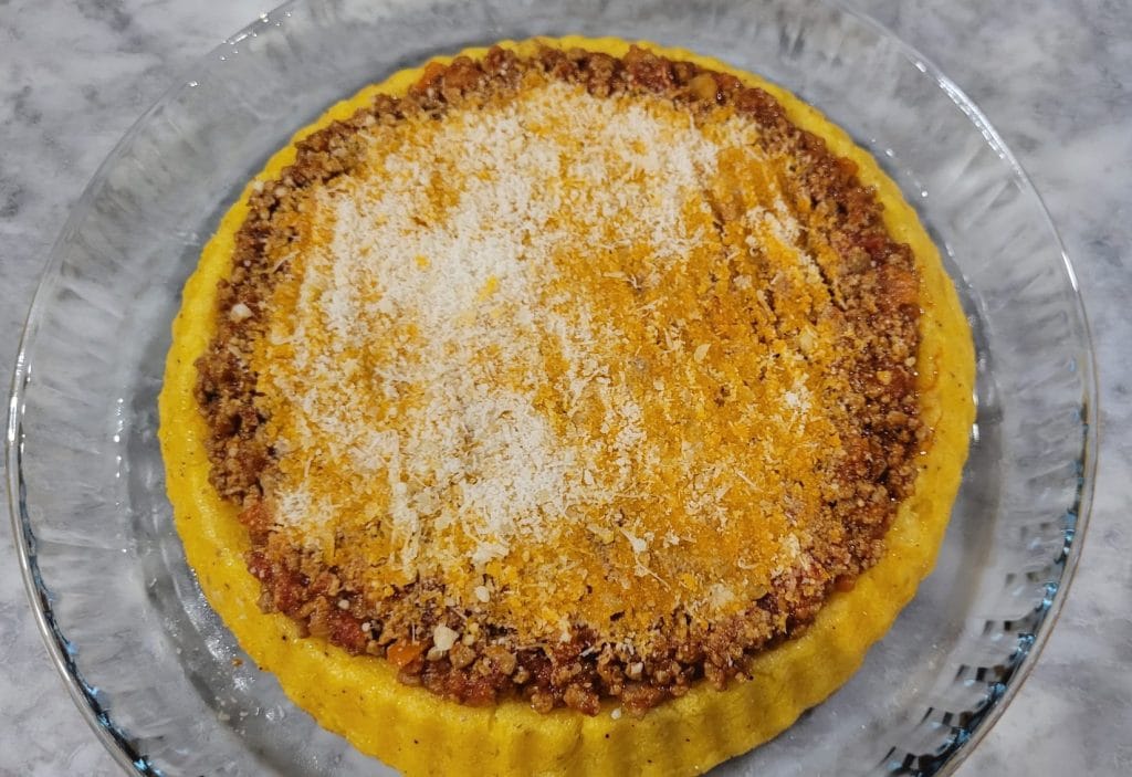 The Polenta Cake with Ragù is a unique, tasty, and hearty dish. To make this cake, I used instant polenta, but if you have the opportunity, you can use cornmeal which requires more time for cooking. Once ready, I put it in a tart pan and placed it in the air fryer to make it a bit crispy, added the ragù with a nice sprinkle of Parmesan, and put it back to gratin…well, delicious! For the ragù preparation, I refer you to the recipe for Lasagna Bundles in Air Fryer, to speed up this time I replaced the fresh sauté with the frozen one.