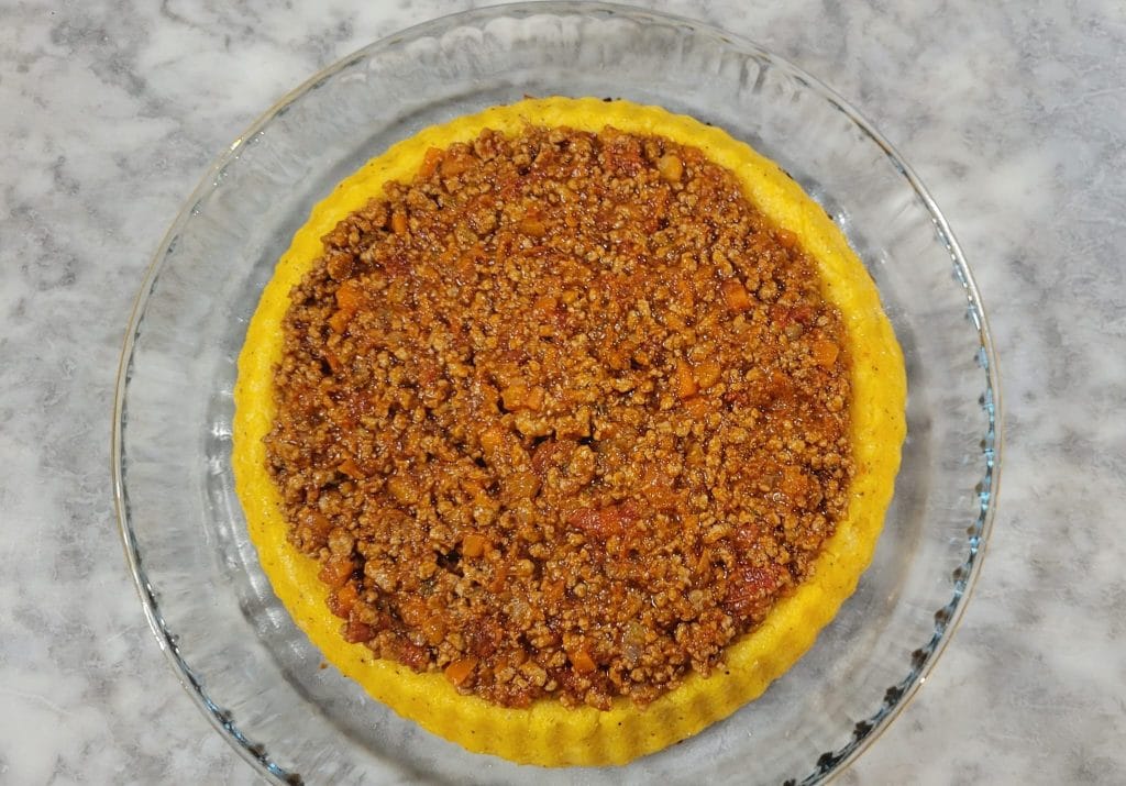 Flip the cake onto another pan and spread the ragù you prepared earlier following the recipe
