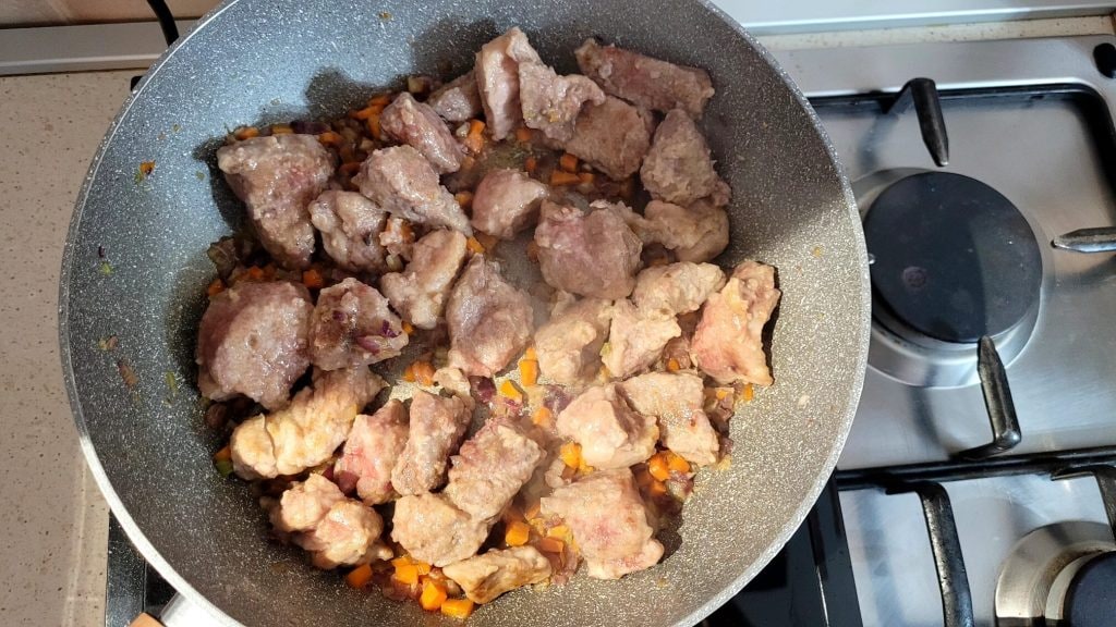 Melt a knob of butter with a tablespoon of extra virgin olive oil and add the previously floured pork pieces, let them brown well and deglaze with 2 tablespoons of extra virgin olive oil