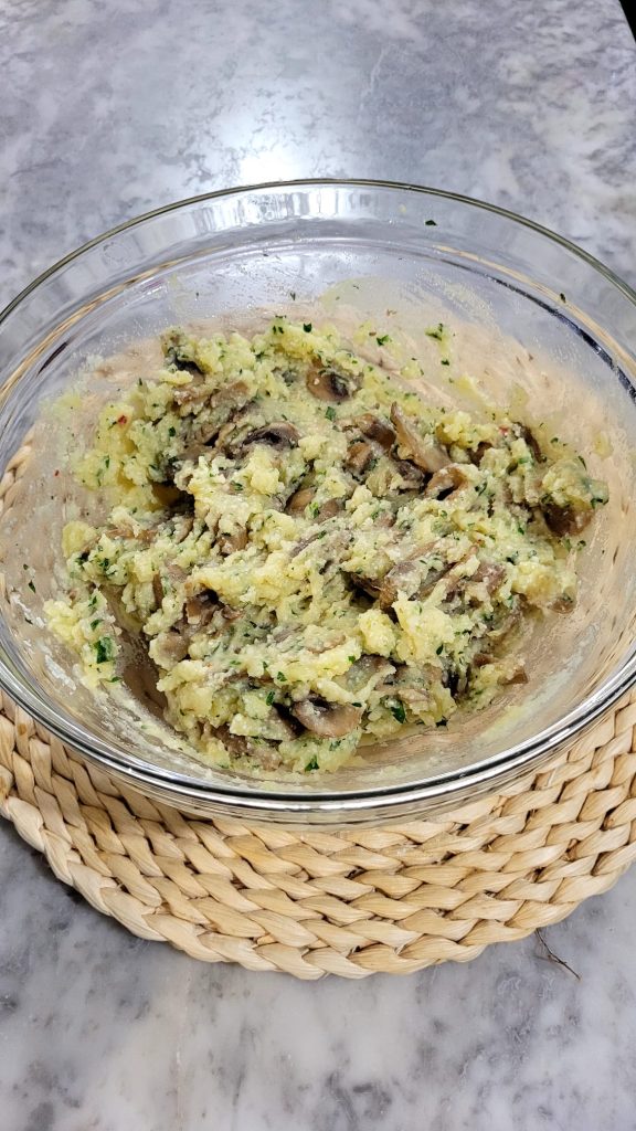 Add the mushrooms to the potato bowl