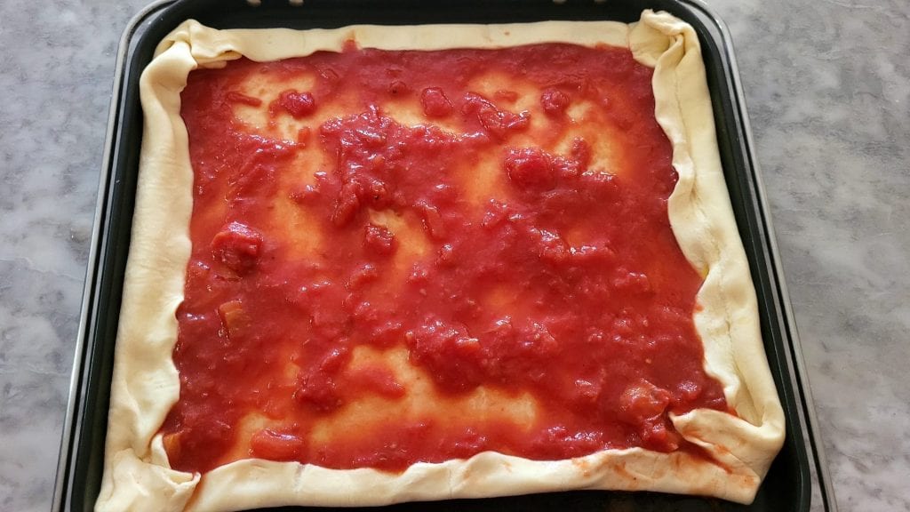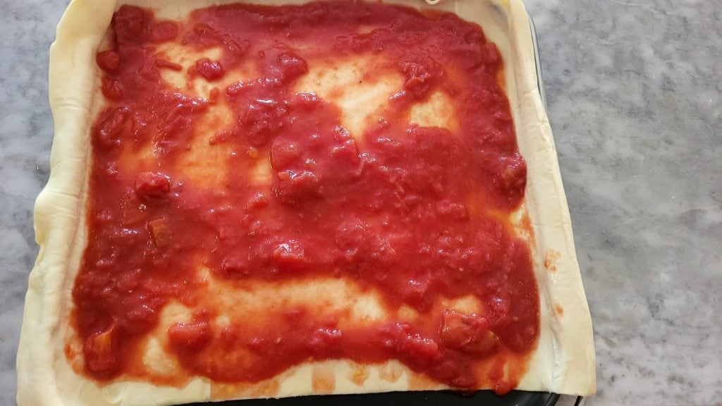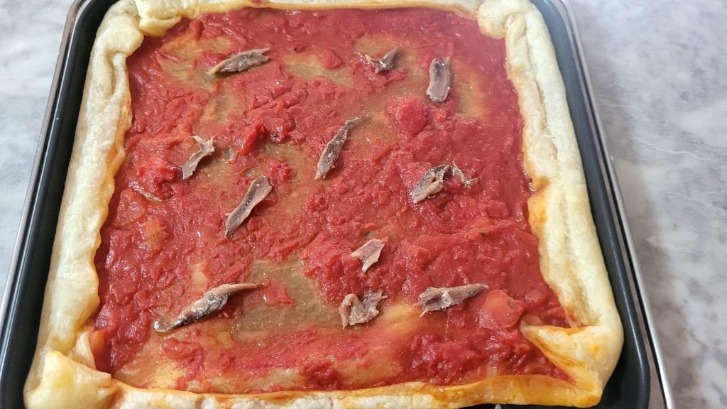 But let’s talk about the puff pastry pizza… just one roll of puff pastry, rectangular or round, some tomato pulp or puree, cheese or mozzarella, I added some anchovies to make it tastier, and in just a few minutes you’ll have a really delicious “fake pizza.” Let’s go see how to prepare the Puff Pastry Pizza