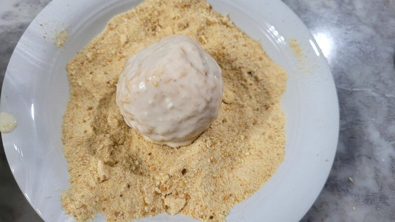 And then in the breadcrumbs, trying to seal well by pressing lightly on the rice ball.