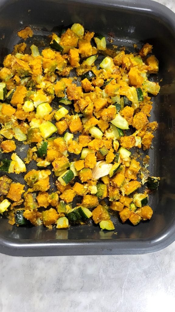 Trim the zucchini after washing and drying them with a paper towel and cut them into cubes as you did with the pumpkin