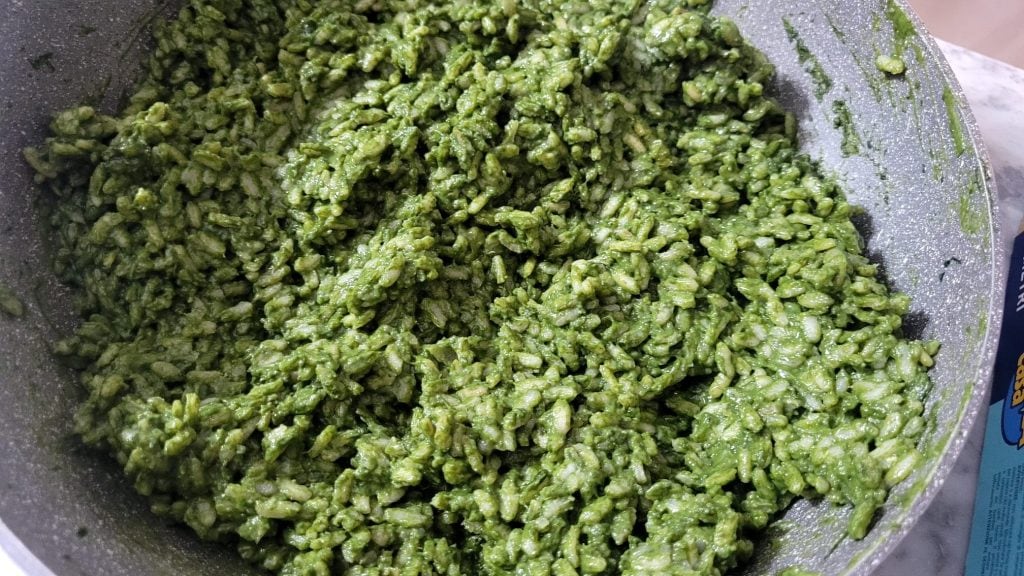 For the Rice and Spinach Balls recipe, I cooked the spinach in a pan with olive oil and garlic, prepared a classic risotto by creaming it with butter and Grana Padano, and once cooled, I added an egg. To make the balls gooey and tasty, I put in the center the sweet Sardo, a fresh soft cheese you can easily replace with mozzarella or whatever you prefer or have available. Shall we prepare them?