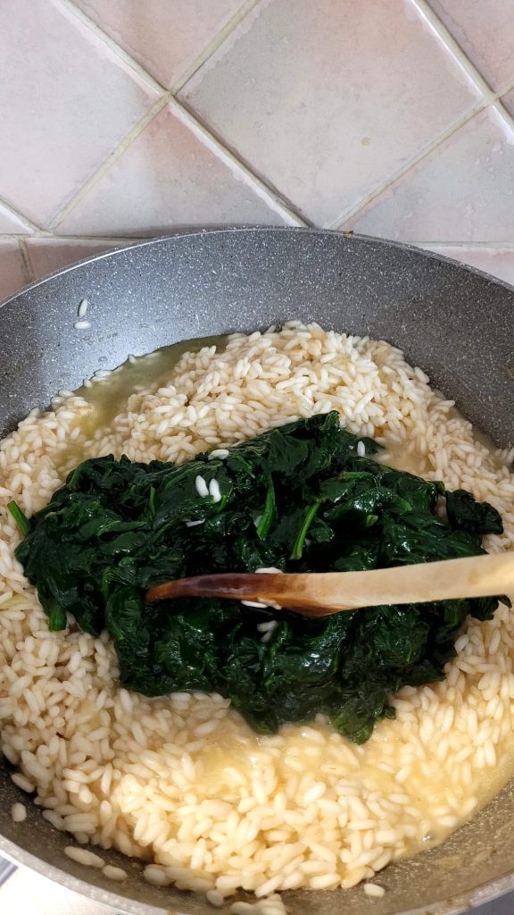 • At about halfway through cooking, add the spinach along with their water, and continue to cook until slightly al dente. It should not be overcooked, add a few more ladles of broth if necessary. The risotto should be soft and compact but not too dry