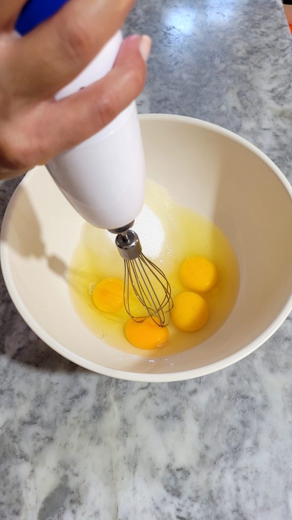 • In another large bowl, beat together the sugar, eggs, and a pinch of salt with an electric whisk for 3-4 minutes until you get a puffy, light, and frothy mixture