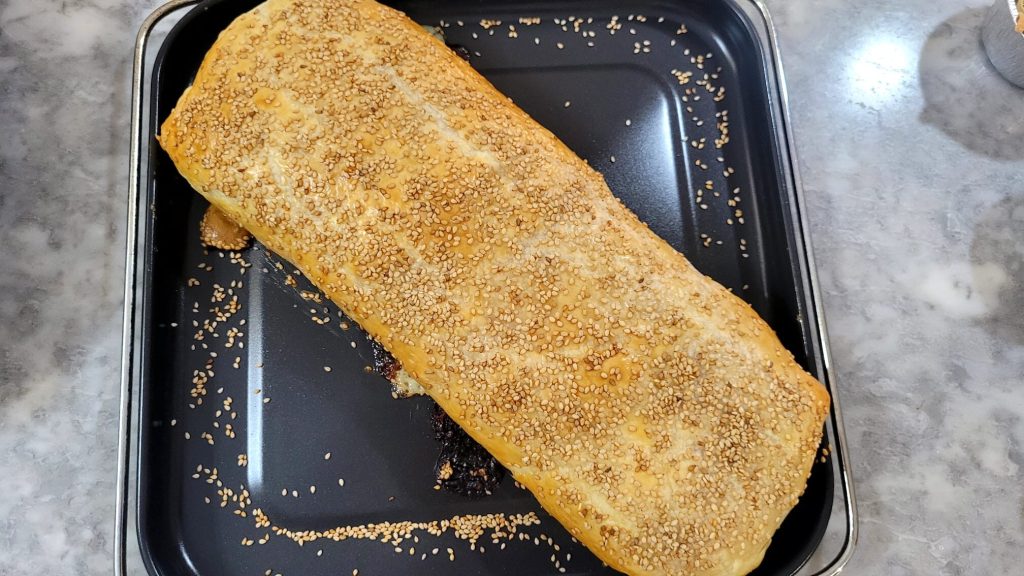 Once ready, remove the strudel and let it rest for a few minutes before taking it off the grill or tray