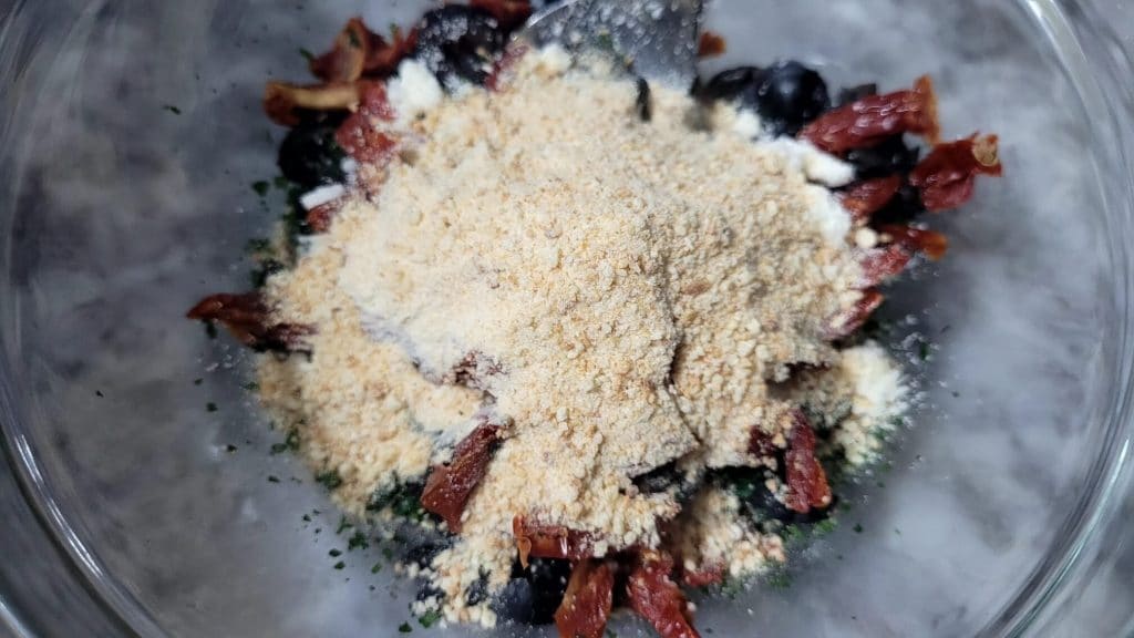 Start by chopping the parsley, slicing the olives and cutting the sun-dried tomatoes into pieces. Put everything in a bowl