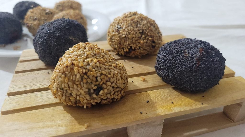 With slightly damp hands, form the balls by taking a bit of the mixture. Roll them in the small bowls you have prepared with the two types of seeds. These are with sesame seeds