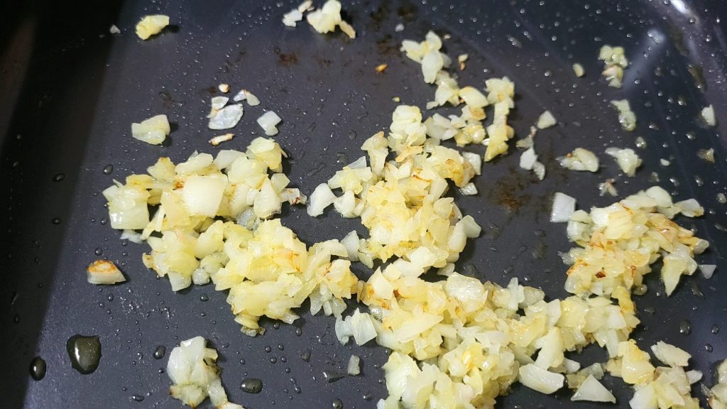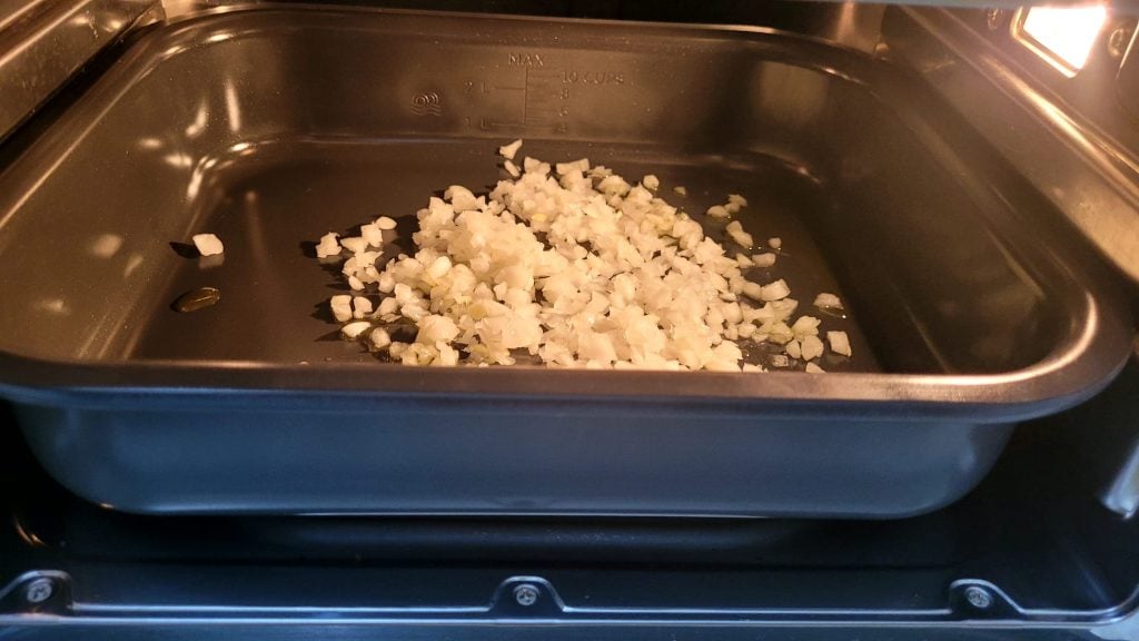 • Peel the onion and let it brown with a drizzle of oil. You can do this step either with the air fry function at 320°F/338°F for a few minutes, being careful not to burn it, or in a small pan