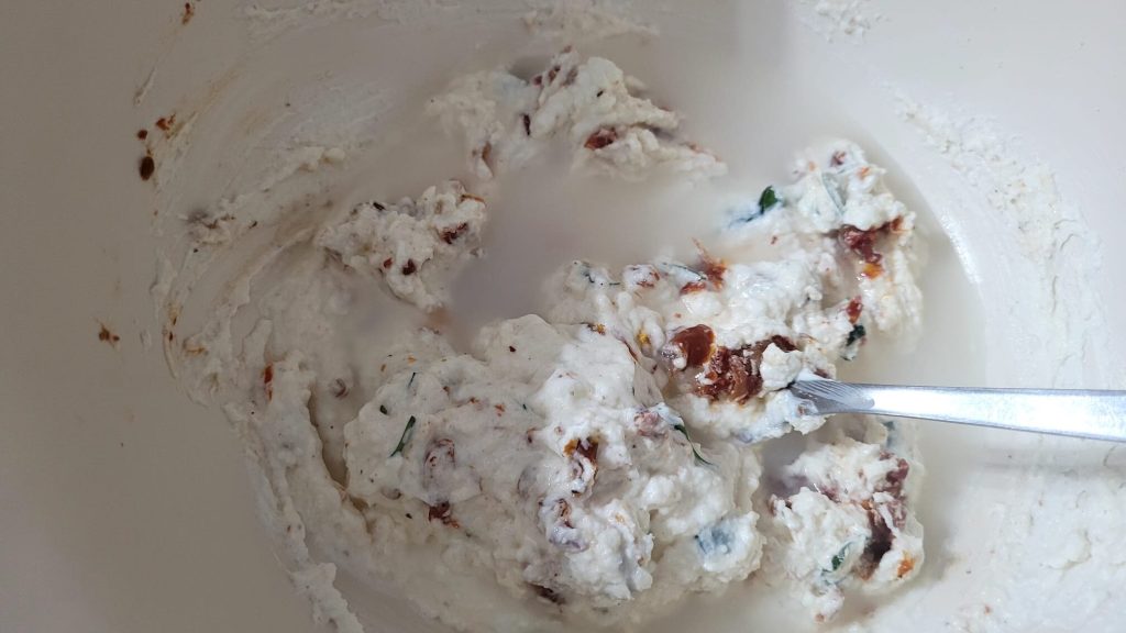 • While the pasta is cooking, in a bowl combine ricotta, Grana, salt, pepper and torn basil leaves