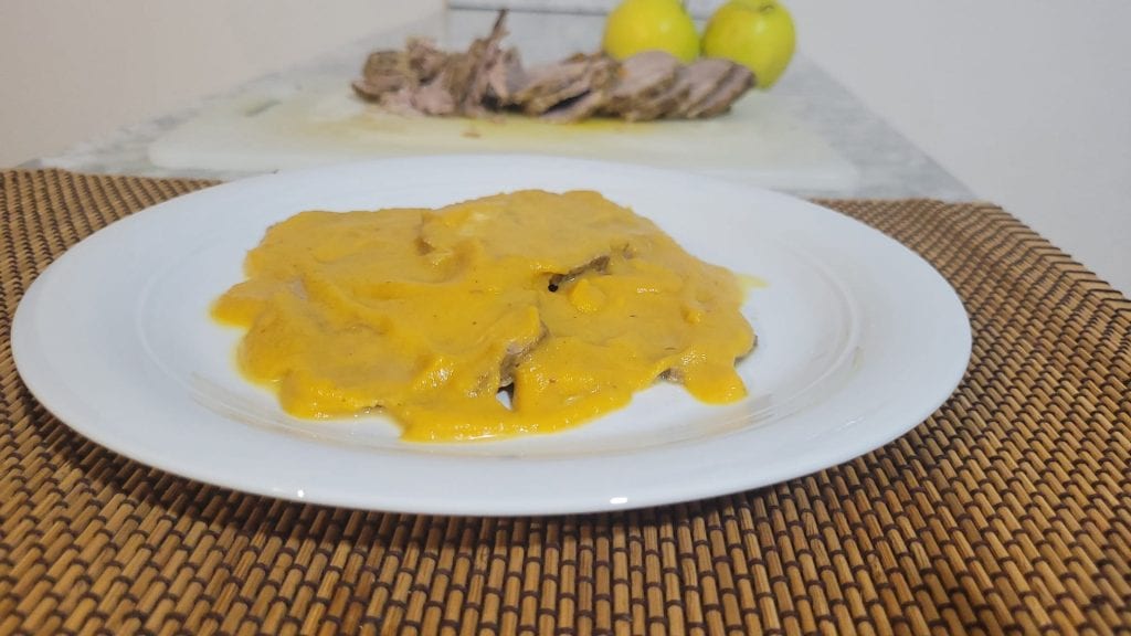 The apples and the sautéed mix are blended with an immersion blender and poured over the slices of roast.