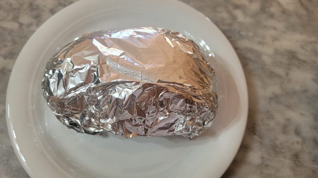Once cooked, the roast with apple sauce is wrapped in aluminum foil to keep the juices inside. It is cooled at room temperature and then transferred to the fridge for a few hours. This step makes slicing the roast with apple sauce easier, especially if done with a knife.