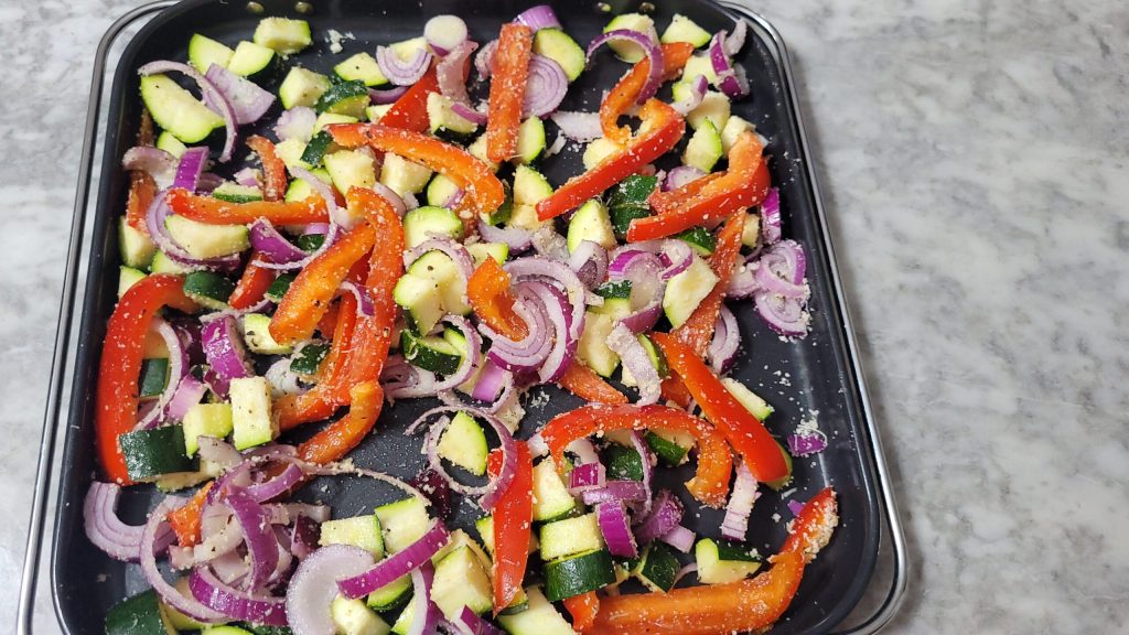 Transfer them to the baking tray and season with extra virgin olive oil, salt, pepper, and grated Grana Padano. Mix with a wooden spoon or silicone spatula and cook at 410°F (210°C) for 15 minutes, stirring a couple of times. Once ready, set them aside