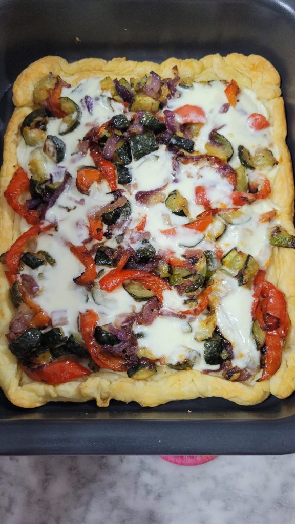 The crust is pre-baked, to which the vegetables, also cooked in the air fryer, are added before continuing the cooking together with the cheese that melts over the vegetables, making everything deliciously tasty.