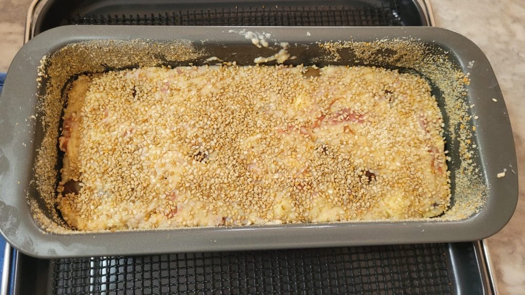 The plumcake is perfect as a main course for a quick lunch, but also for a buffet or an aperitif. I decorated the plumcake with sesame seeds (which I love) that you can replace with poppy seeds or pumpkin seeds, or, if you prefer, you can leave it undecorated and simple. Once again for the cooking of the savory plumcake I used my beloved kitchen ally.. the air fryer. Nothing prevents you from cooking it in your classic oven, in that case, you will need to preheat it to bring it up to temperature. The plumcake pan I used is non-stick and measures 9 x 4 inches, you can replace it with a disposable aluminum one or if you don’t have the pan use a 8-inch cake pan or muffins!! But… let’s prepare it…