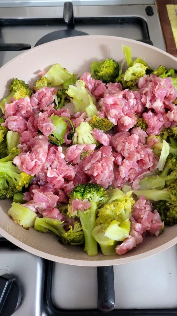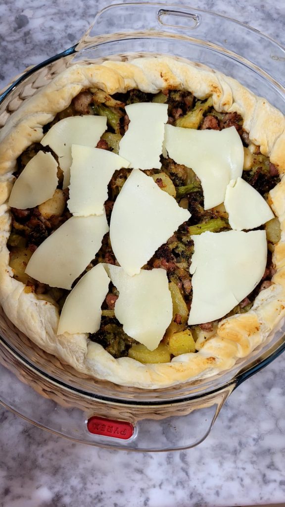 It’s very easy to prepare, and the air fryer cooking ensures a golden and fragrant savory pie: cook the potatoes and broccoli, then sauté with the sausage in a pan, add the cheeses, in this case, parmesan, diced sharp provolone, and to complete, a few slices of smoked cheese. Then, roll out the pastry in the mold, pour in the filling, and cook in the air fryer until the surface is golden and the cheese is melted. The result is a high savory pie, soft inside, and crispy outside.