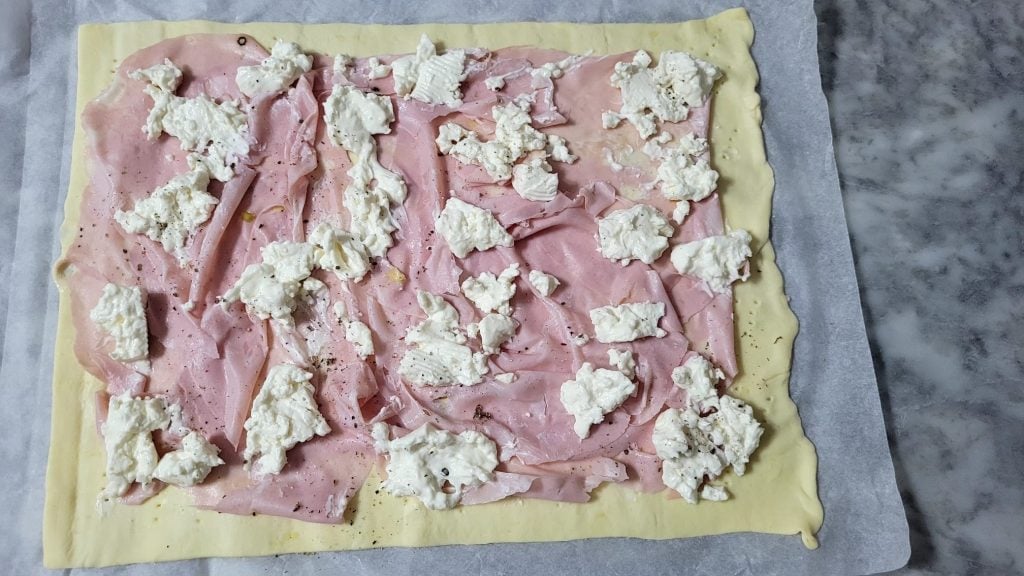 If you like a crunchier crust on the surface, you can cover it with sesame seeds, as I did, or poppy seeds. For this recipe, I’ve used a ready-made rectangular puff pastry, so it takes just a few minutes to prepare a tasty strudel. Besides strudels with puff pastry, you can make many things like the Savory Pie with Vegetables and Stracchino in the Air Fryer or the Creamy Potato Meatloaf in Crust. Now let’s see how to prepare this delicious savory strudel with stracchino, mortadella, and pistachio crumbles