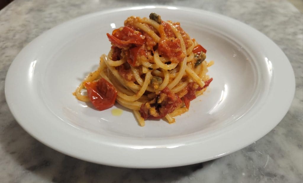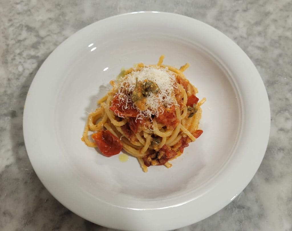 Spaghetti with gratinated tomatoes is a simple yet particular first course. The pleasant combination of the sweetness of the tomato with capers, anchovies, and the strong flavor of Parmesan, which when gratinated gives a special taste to these spaghetti. My recipe uses spaghetti alla chitarra, but it is a sauce that goes well with other formats of short pasta, such as penne, maccheroni, or casarecce. As for the variety of tomatoes, I used piccadilly, which can be replaced with datterino, the important thing is that the tomatoes are ripe, while the capers are in salt, which I desalted by leaving them in a cup with water for about ten minutes and rinsing them well. For the gratination of the tomatoes, I used the air fryer, but it is possible to gratinate them in the traditional oven.