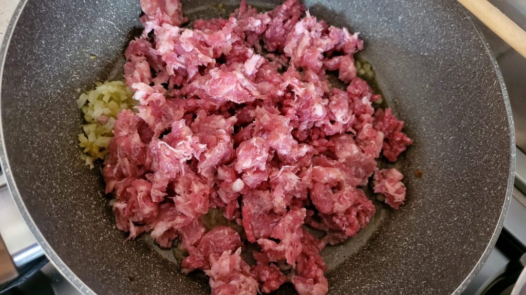 As soon as the onion is ready, add the sausage and ground meat and let it brown