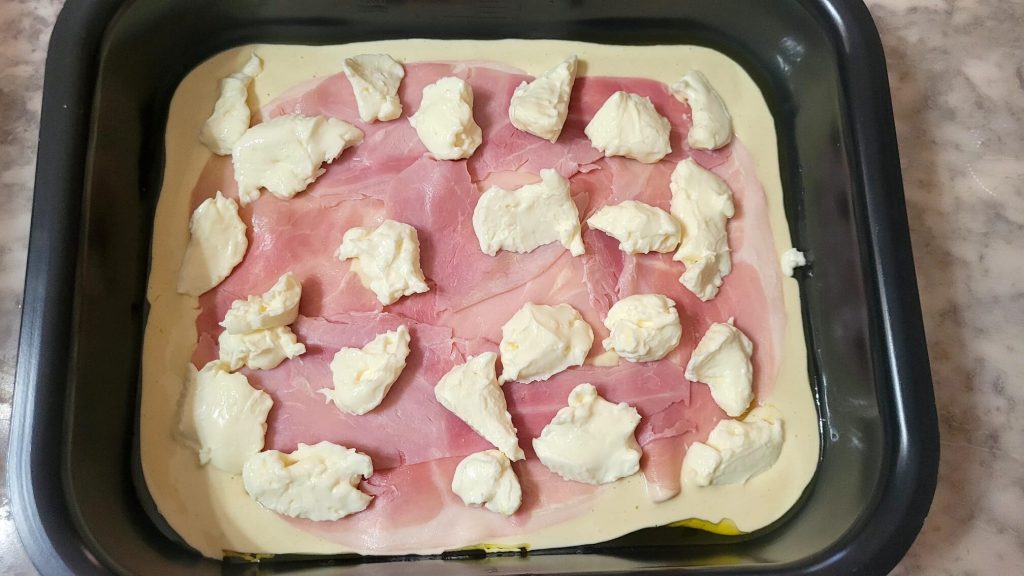 • Add the sliced cooked ham and distribute the stracchino or whatever you’ve decided to use to fill it