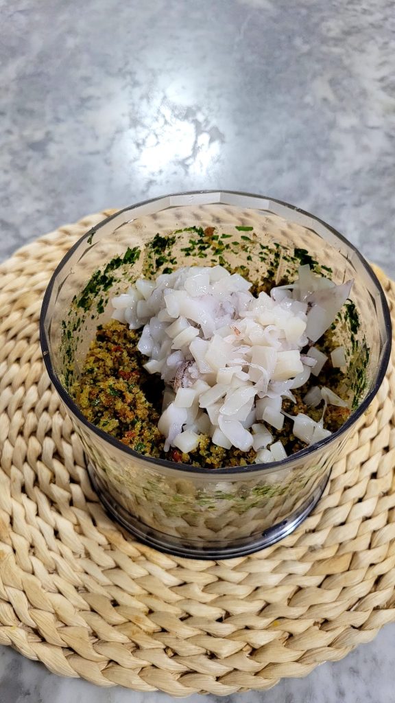 The stuffing I chose is rich and aromatic: stale bread, capers, garlic, extra virgin olive oil, anchovies, sun-dried tomatoes, Parmesan and the squid’s tentacles and fins. The result is a perfect balance between tenderness and a pronounced sea flavor, with a salty and aromatic note.