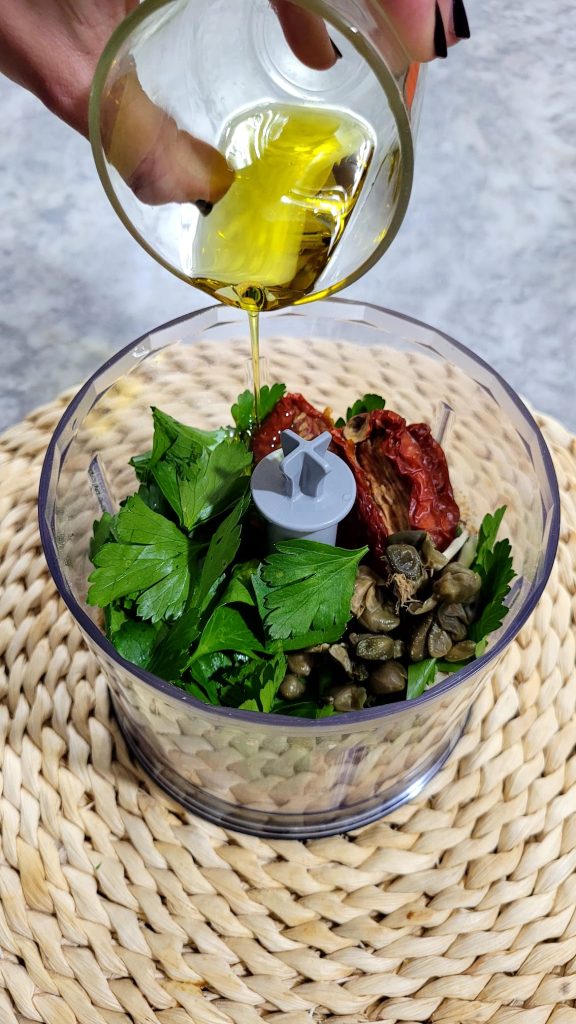 Add the rinsed capers, the garlic, the anchovy fillets, sun-dried tomatoes, parsley, oil and a little pepper.