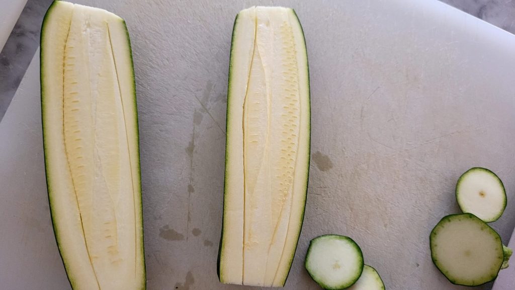 After washing the zucchini, trim both ends and cut them in half lengthwise. Score the flesh with a knife, leaving a border of about 1/4 inch and being careful not to break or puncture the skin. This will be the space for the filling.