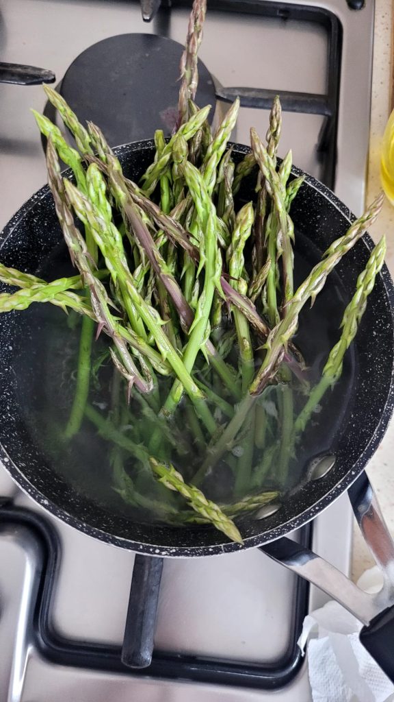 Before gratinating, the wild asparagus will be boiled for a few minutes in lightly salted water, just long enough to become tender but remain crisp. If, like me, you don’t have a specific tool to cook them, this simple pot method works very well and allows you to achieve a perfect result even without special equipment.
