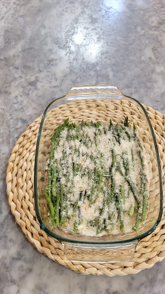 • Lightly grease a baking dish with extra virgin olive oil and arrange the asparagus without overlapping them.