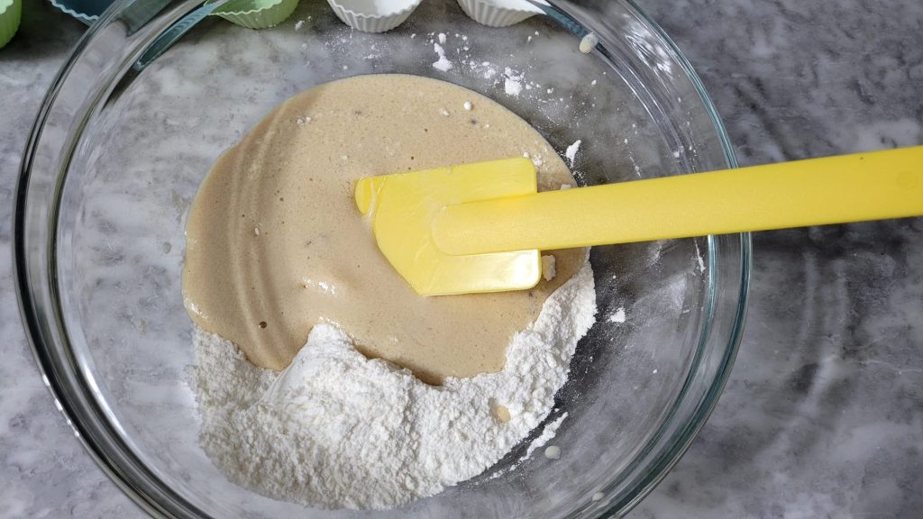 • In another bowl, pour the flours, sugar, and sifted baking powder