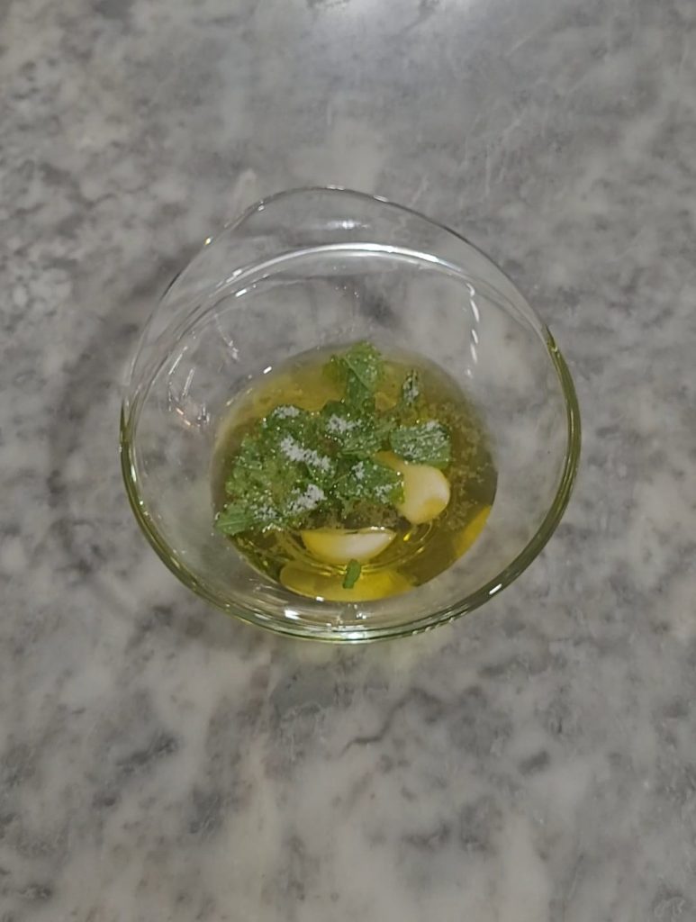 Start by preparing the emulsion, as it will begin to marinate and absorb flavor. Take a small bowl, cut the garlic clove in half, and add the olive oil, vinegar, chopped mint leaves, and a pinch of salt. Mix and set aside