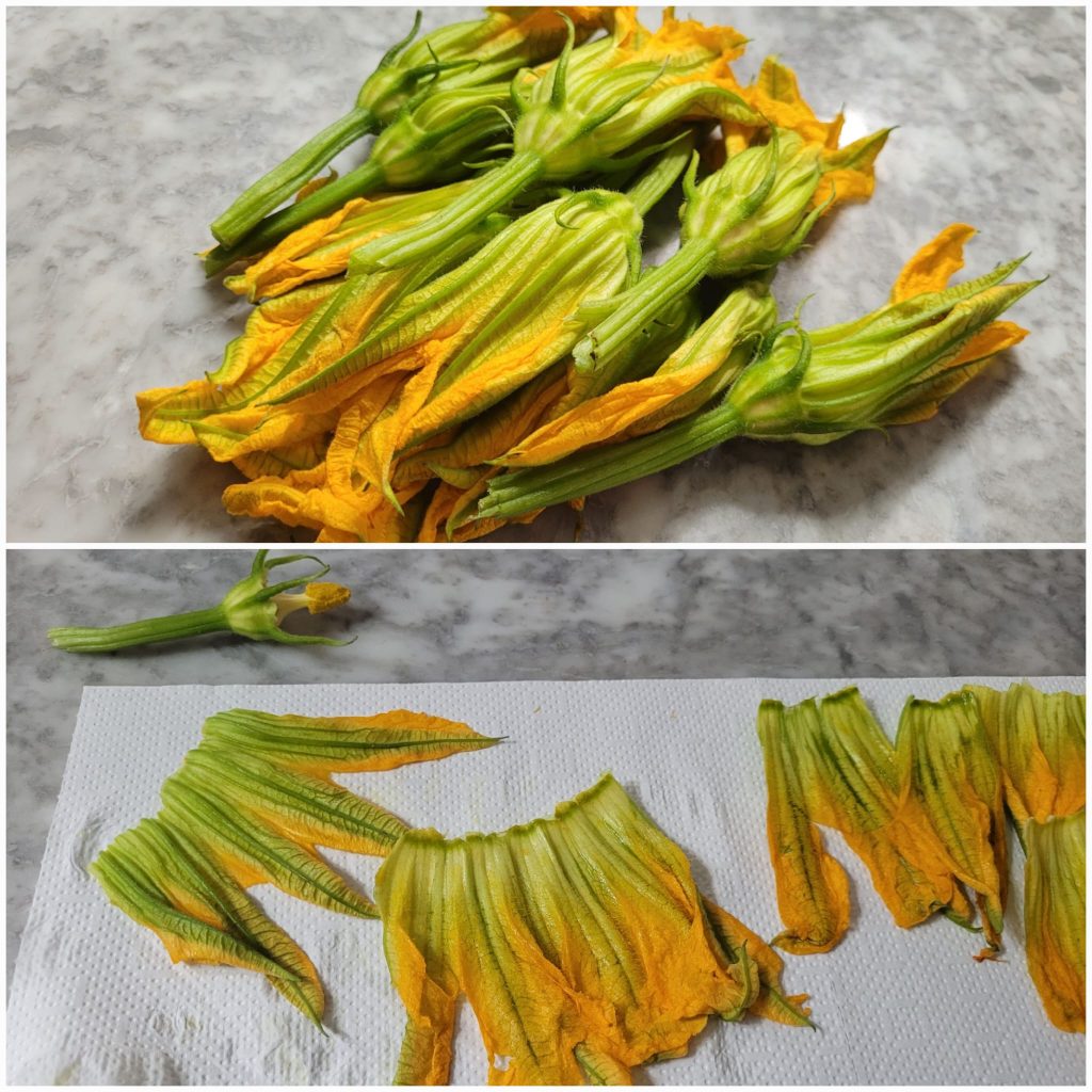 Now on to the zucchini flowers. Remove the stem and pistil from the flower, opening them very gently. Clean them with a paper towel dampened with water, both inside and out