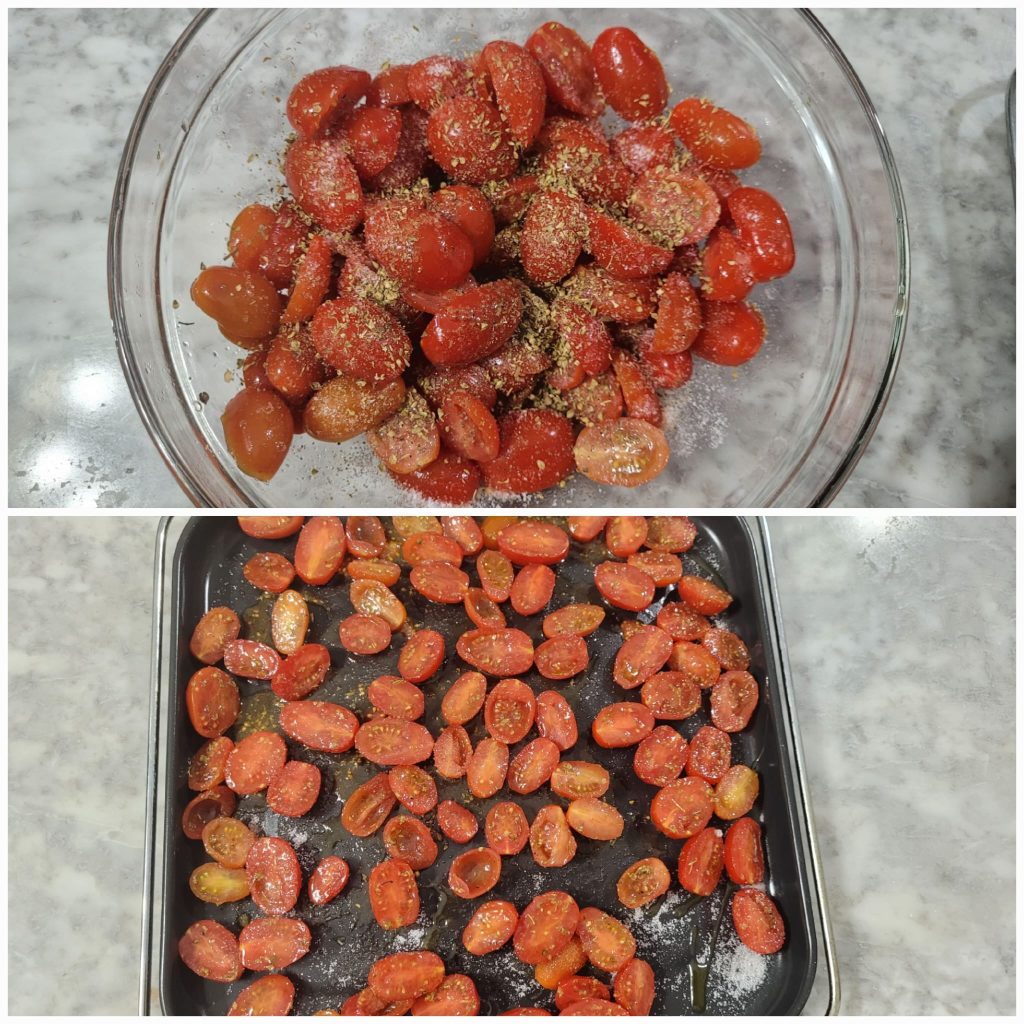 After washing and drying the cherry tomatoes, cut them in half and transfer them to a bowl. Season with extra virgin olive oil, oregano, salt, and pepper, and mix well. Place them in a baking tray with the cut side up and sprinkle with sugar
