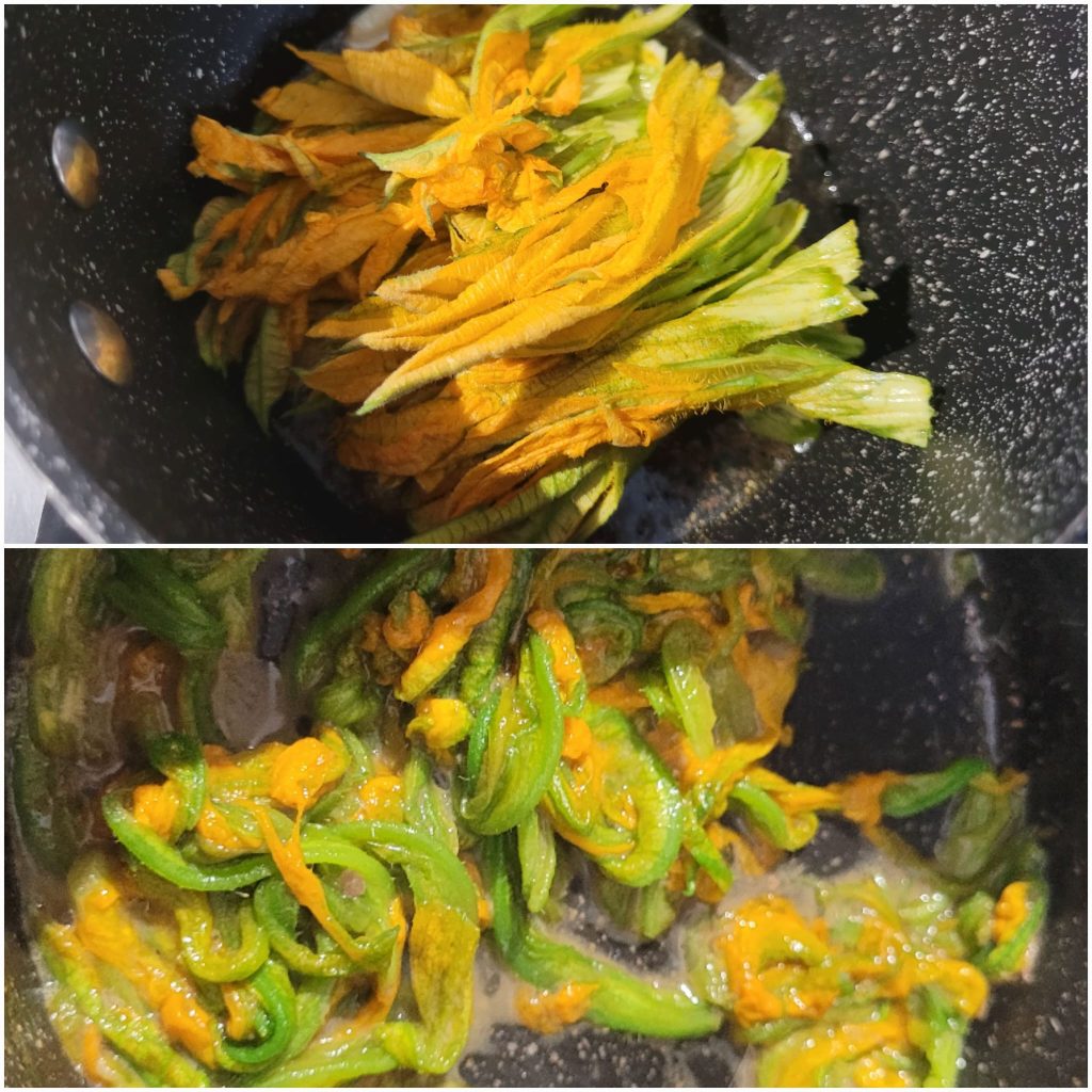 Remove the garlic clove and add the sliced zucchini flowers, stir and cook them over low heat, it will take a few minutes. Do not add salt